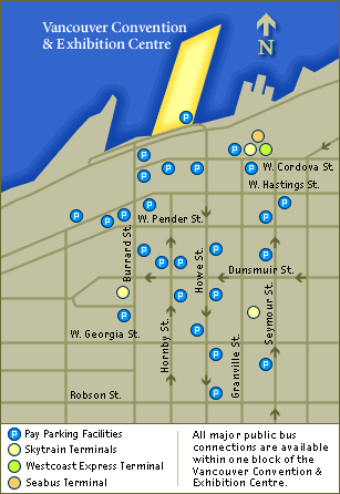Getting around Vancouver and the Convention CentreVancouver is located in the South West corner of British Columbia, the westernmost of Canada's 10 provinces, just one hour north of the border with the United States. Getting to and from VancouverBy plane:International airlines fly daily into Vancouver International Airport (YVR). Located just 25 minutes from downtown, YVR is consistently rated one of the best airports in North America. There are more than a dozen international flights in and out of YVR every day, with 22 bound for the United States. Participants arriving by plane will be shuttled to their hotel at no cost. During the week shuttles will be provided from hotels to the Convention Centre free of charge. This service will also be avalaible to return participants to the airport. There are several other options to go between the airport and downtown Vancouver, including scheduled coach transfers, limousine, taxi, car rentals and transit.